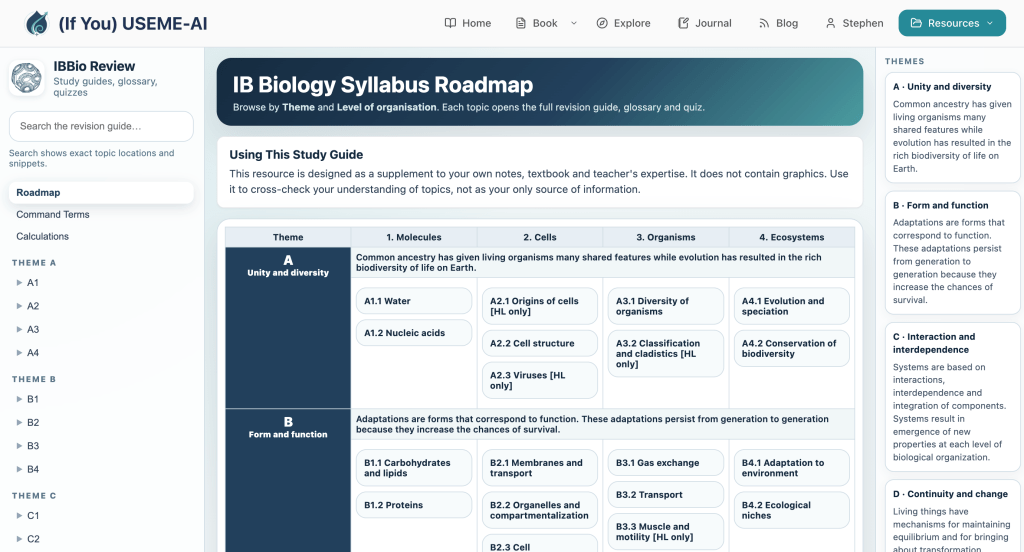 It has been many years since I posted an IB Biology resource… with a lot of help from my friends Claude and Lovable, here we go. A text-based, mobile-friendly study support for students. There is still some work to do, but with the exams around the corner, it might help. Have a look around and see if it is useful. It is embedded in the (If You) USEME-AI: Learning for Hope & Agency in an AI World site, so you can use some of the Prompts & Poes and other resources to support your revision.