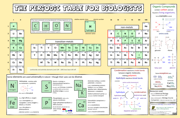 This is designed to address some of the assessment statements for the Chemistry of Life unit, and to provide a clear wall-chart that is free to use and free from advertising. I recently updated it with relative atomic masses and a couple of corrections. Download the full A0 poster here: http://is.gd/iBiologyPTable.