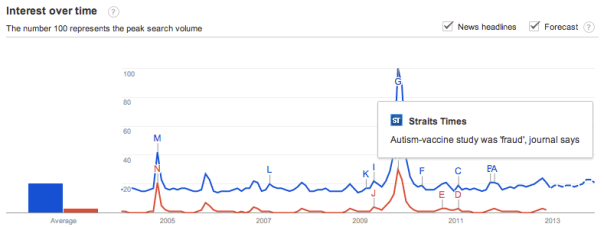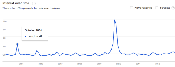This could lead to a quick (though basic) way to set up some simple data-based questions or stimulus for exploration. Here is a plot for the search term “vaccine”. Think of the questions it might raise in discussion.