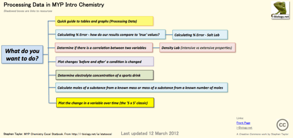 This Excel workbook is built upon the IBDP Bio Excel Statbook I made in 2011. It is designed to make life easier as we work through labs in Grade 9 Intro Chem and to help you find your way around some Excel tricks.